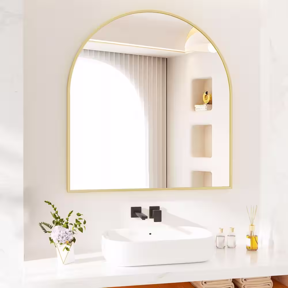 XRAMFY 31.5 in. W x 33.5 in. H Arched Gold Modern Aluminum Alloy Framed Wall Mirror
