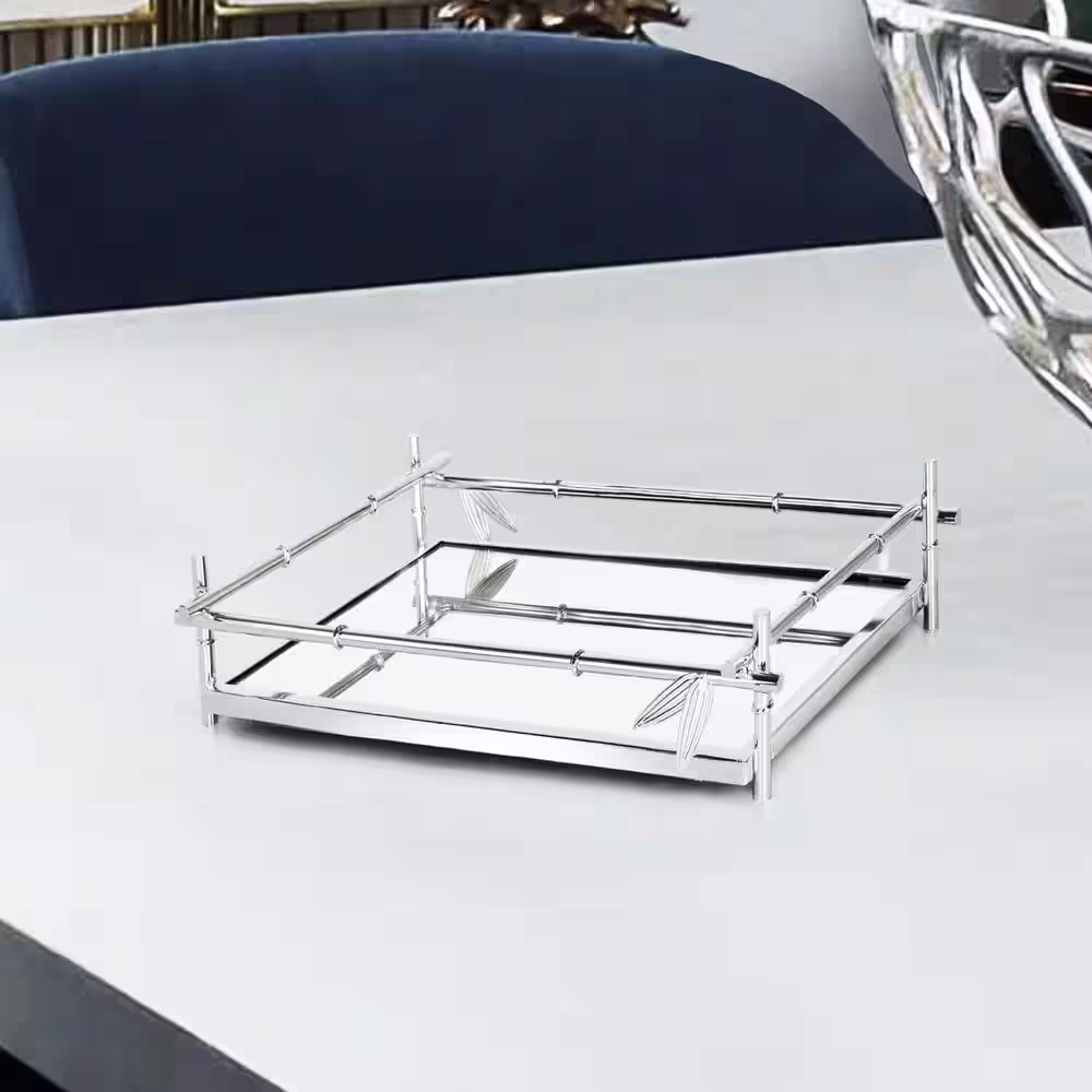 None 12 in. Bamboo Style Rectangle Metal Mirror Silver Decorative Tray