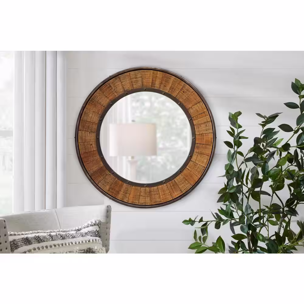 None Medium Round Farmhouse Accent Mirror with Wood Finish (31 in. Diameter)