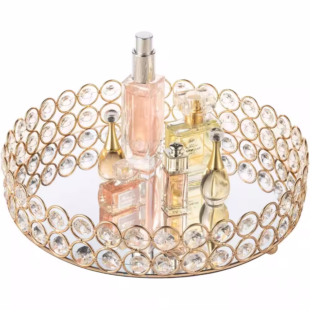 Cubilan 10.6"L x 9.5"W Gold Crystal Cosmetic Makeup Tray Mirrored Decorative Tray