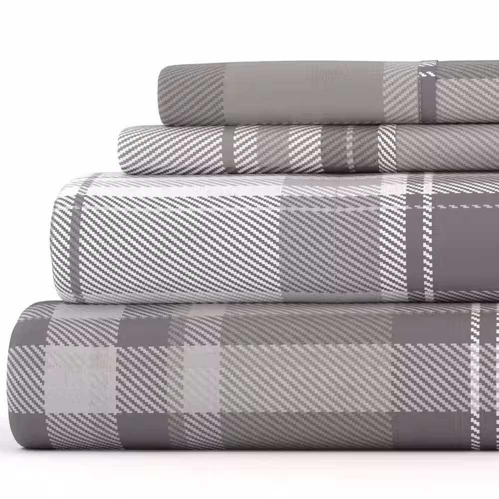 Becky Cameron Premium 4 Piece Light Gray Plaid Flannel Full Sheet Set