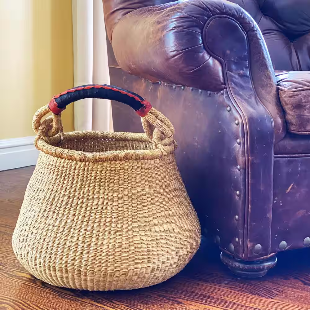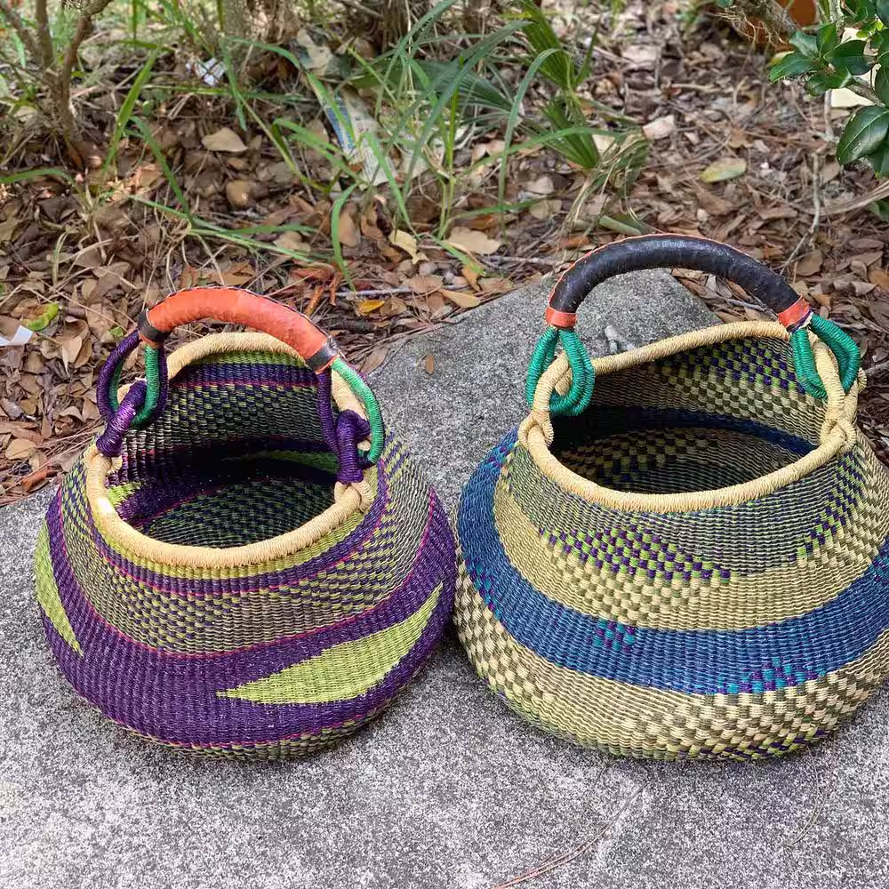 None Natural with Leather Handle Bolga Pot Elephant Grass Basket