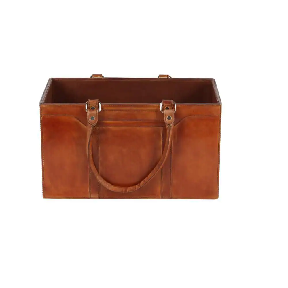 Litton Lane Brown Handmade Box Style Standing Magazine Holder with Detail Stitching and Curved Handles