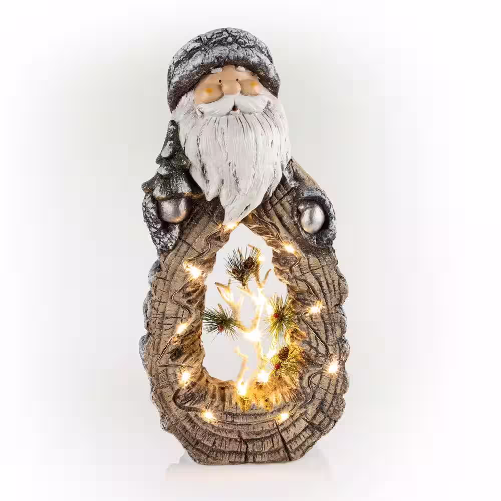 Alpine Corporation 21 in. Tall Santa Statue with Carved Wood Look and LED Lights