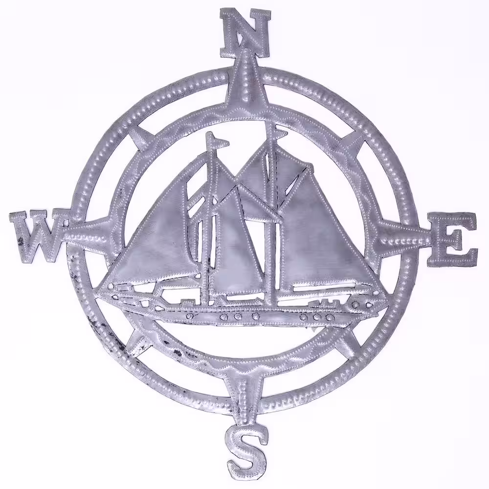 None Nautical Compass with Sailboats Haitian Metal Wall Art 12 in.