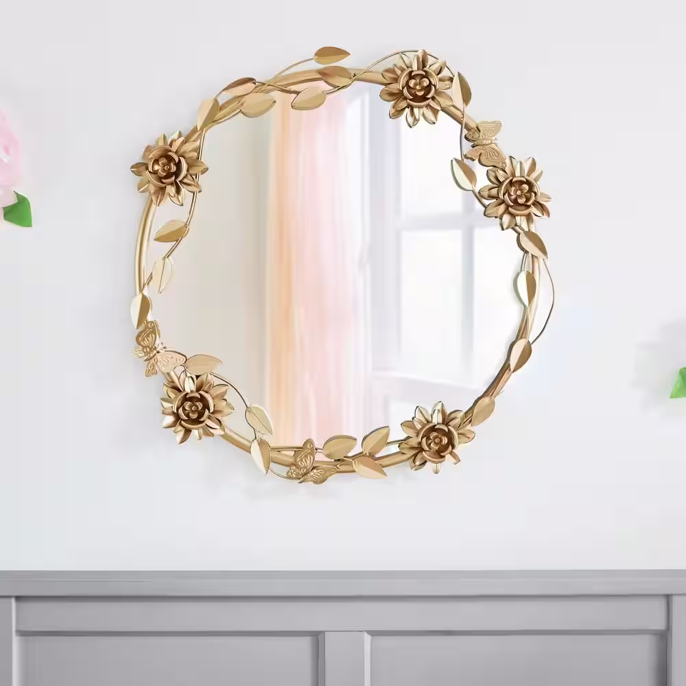 StyleWell Kids Medium Round Ornate Gold Leaf Mirror with Flowers and Butterflies (24 in.)