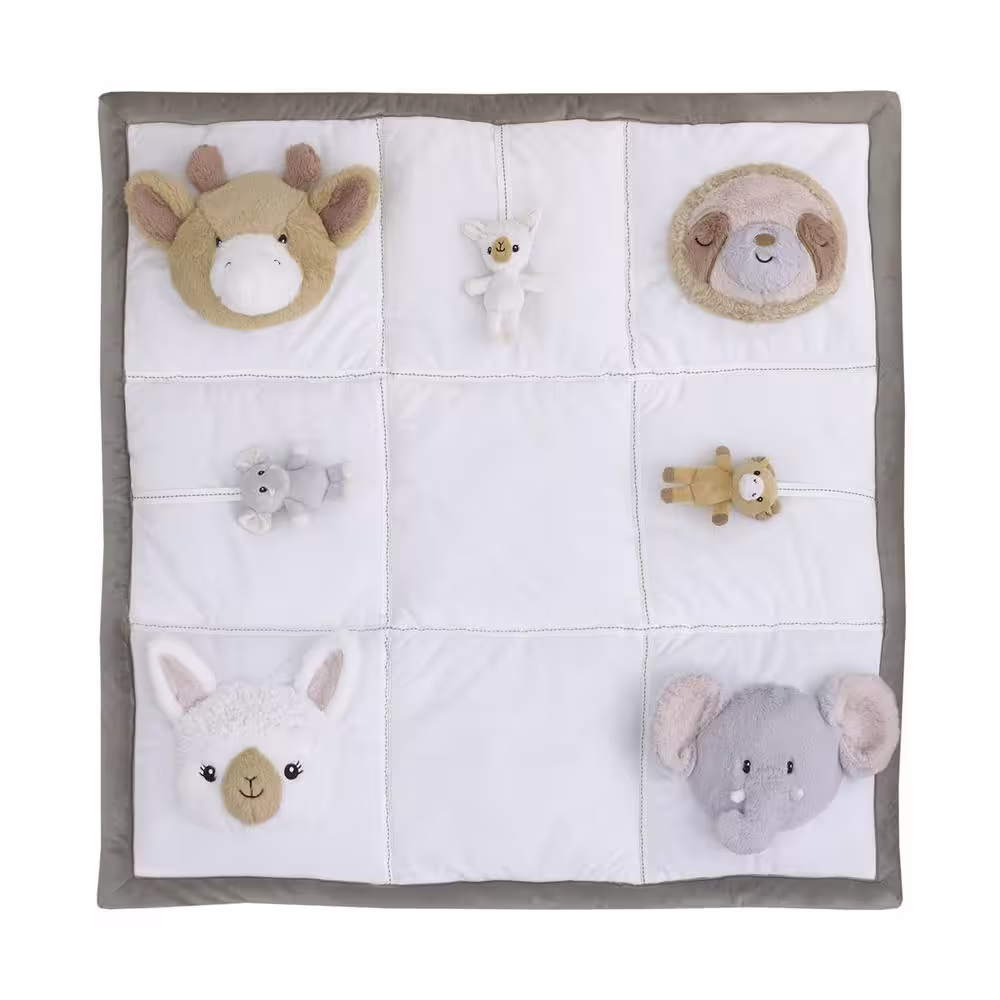 NoJo Playful Pals White, Tan, and Gray 3D Animals With Crinkle Plush Tummy Time Play Mat