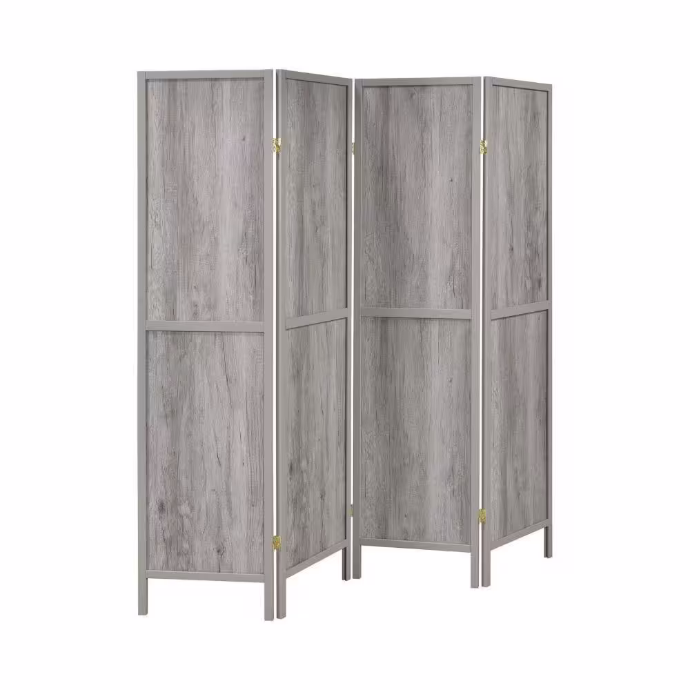 Benjara 70 in. Rustic Gray Abstract Pattern Wood 4-Panel Folding Screen Room Divider