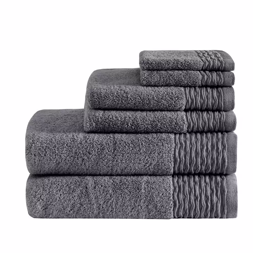Madison Park Aer 6-Piece Charcoal Cotton Bath Towel Set Jacquard Wavy Border Zero Twist Antimicrobial