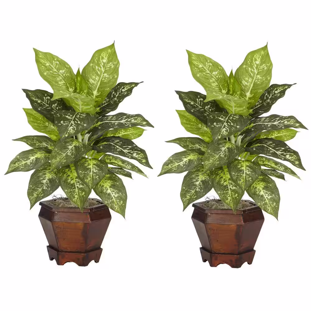 Nearly Natural 20.5 in. Artificial H Green Dieffenbachia Silk Plant with Wood Vase (Set of 2)