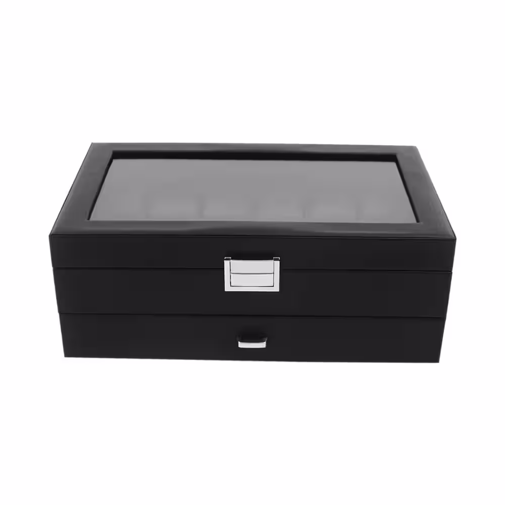 None Watch Box 24 Slot Case Glass Top Black and Display Organizer Lockable