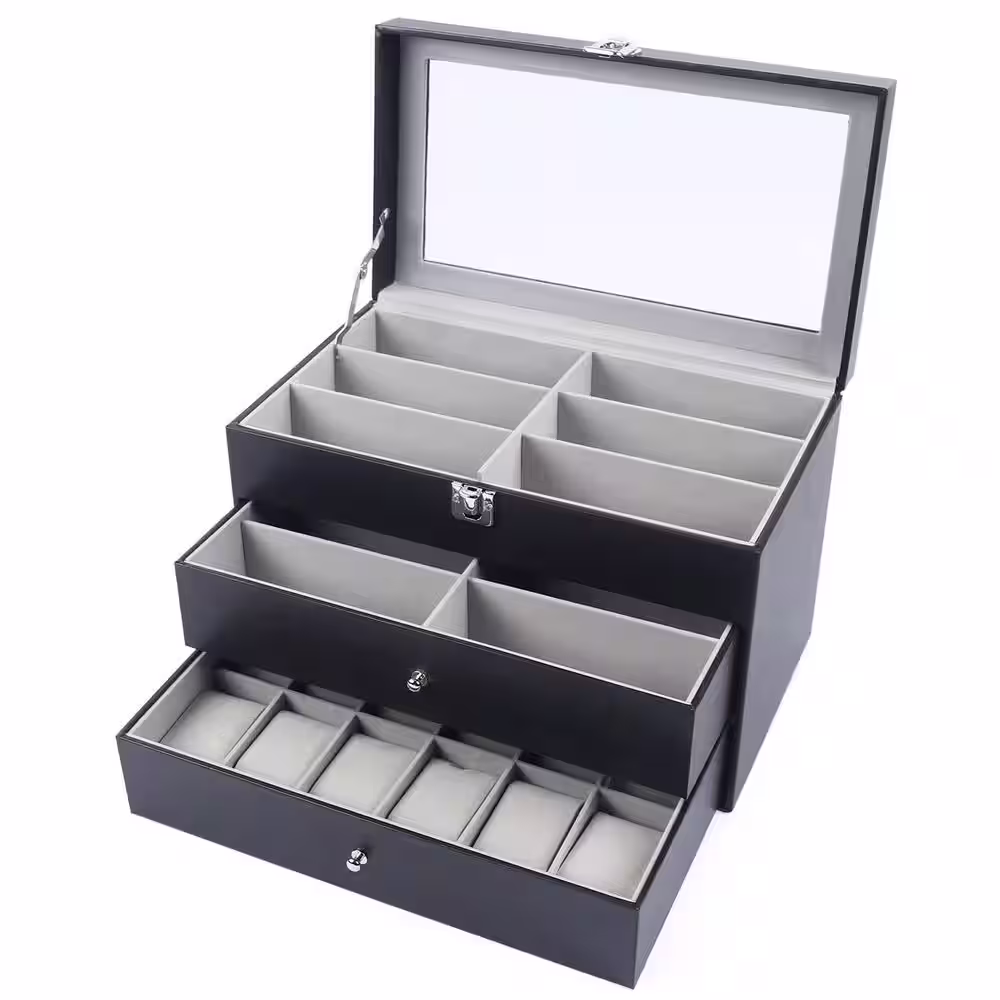 None Black Leather 12-Watch and 12-Eyeglasses Organizer Display Box With Metal Buckle
