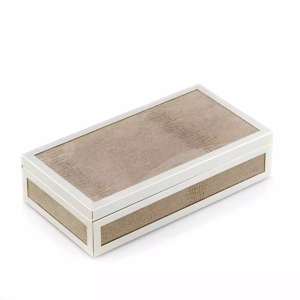 BEY-BERK Silver Plated 8 3/4 in. x 4 1/2 in. Rectangular Hinged Box with "Lizard" Fabric Design and Black Velvet Lining