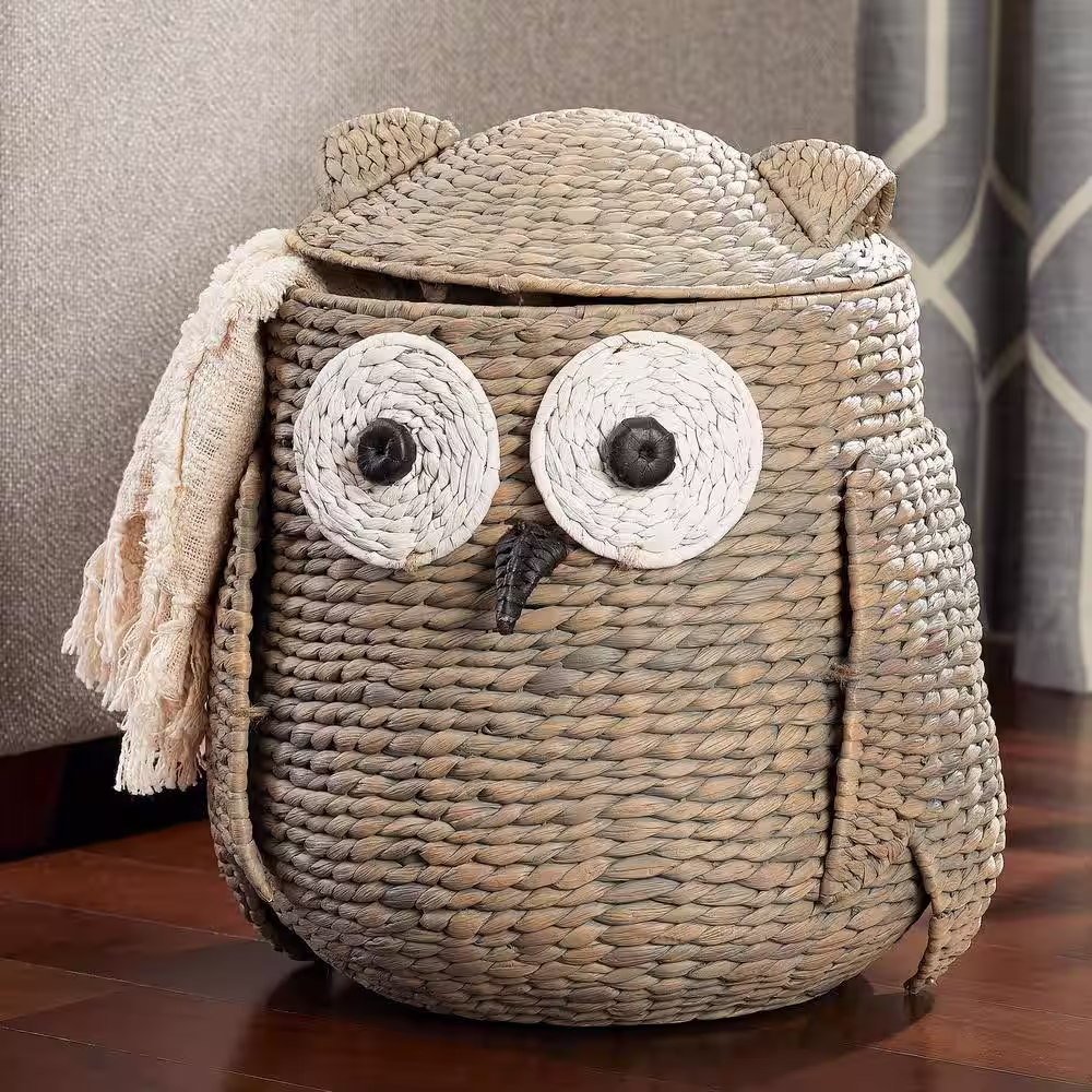 None Owl Wicker Water Hyacinth Woven Decorative Basket with Lid