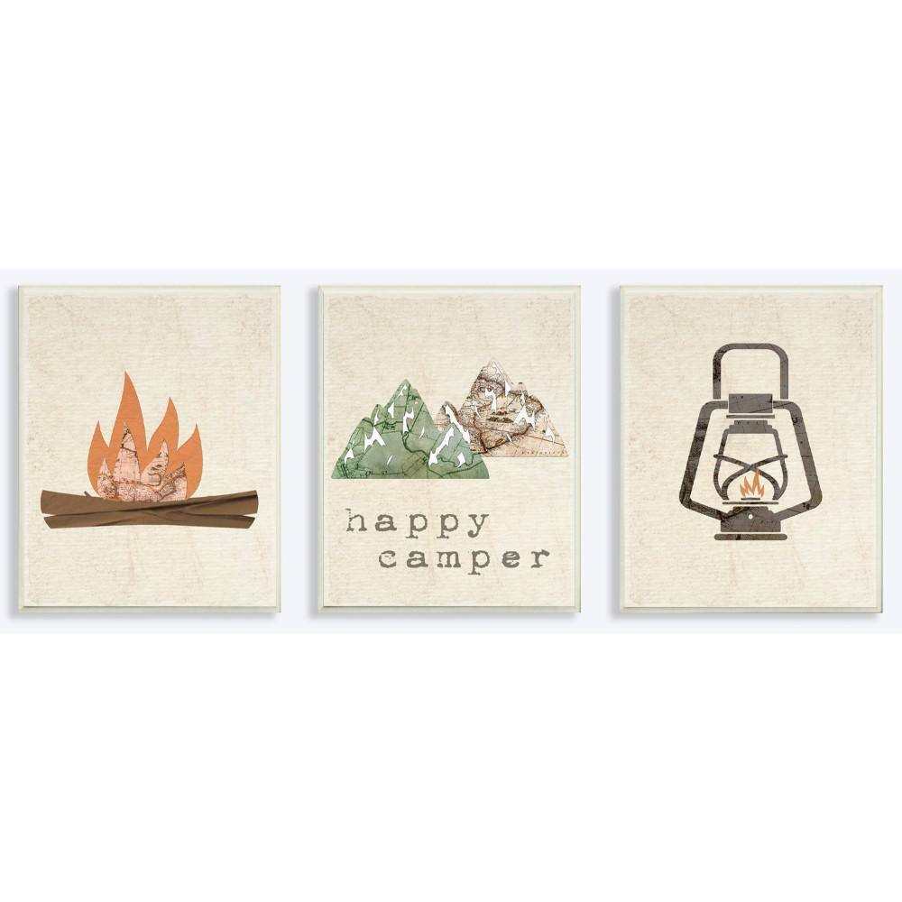 Stupell Industries 10 in. x 15 in. "Happy Camper Mountains and Lantern" by Daphne Polselli Printed Wood Wall Art 3-Piece