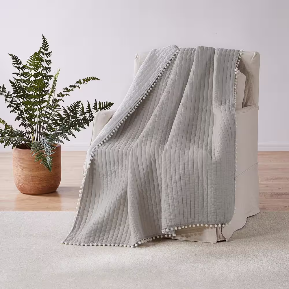 None Pom Pom Taupe Quilted Cotton Throw Blanket