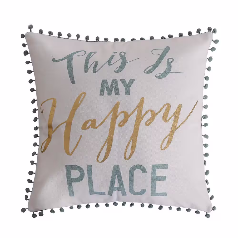 None Olympia White, Teal and Gold "This Is My Happy Place" Sentiment Pillow With Pom Pom Edge 18 in. x 18 in. Throw Pillow