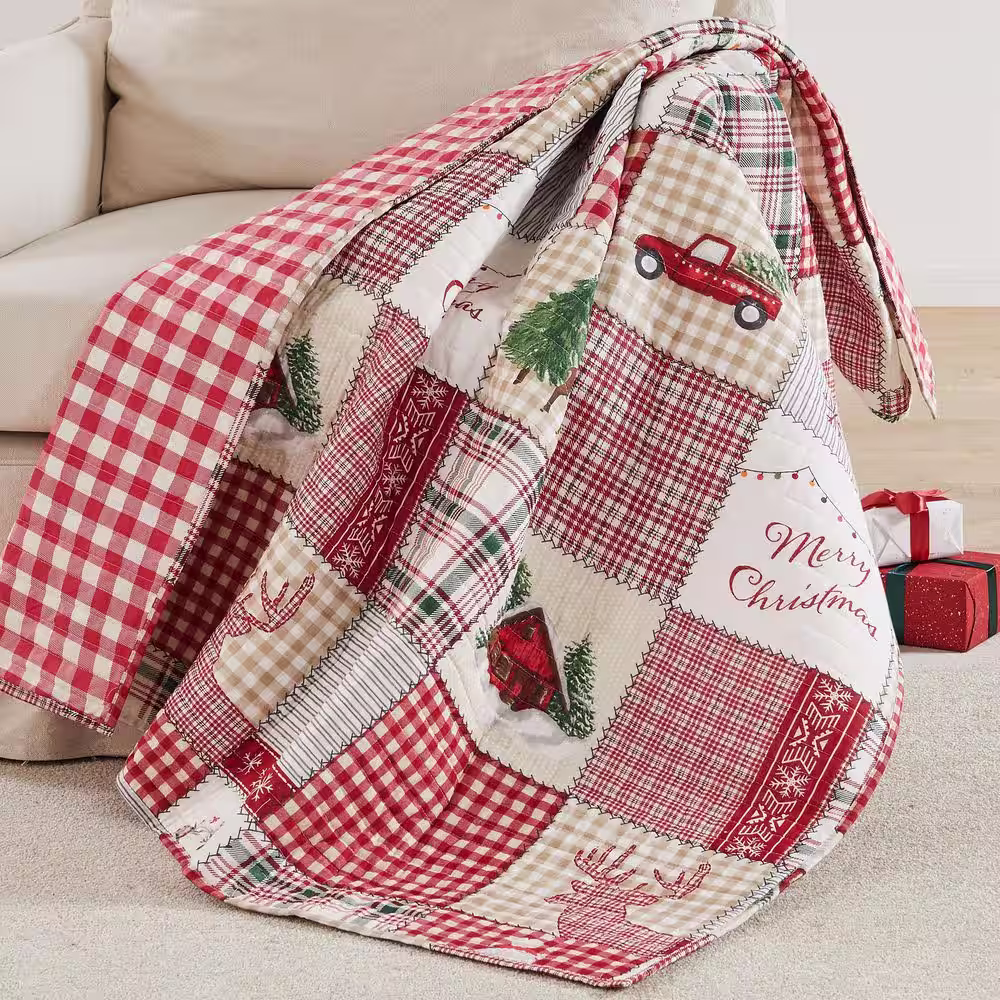None Home For Christmas Multicolor Holiday Patchwork Quilted Cotton Throw Blanket