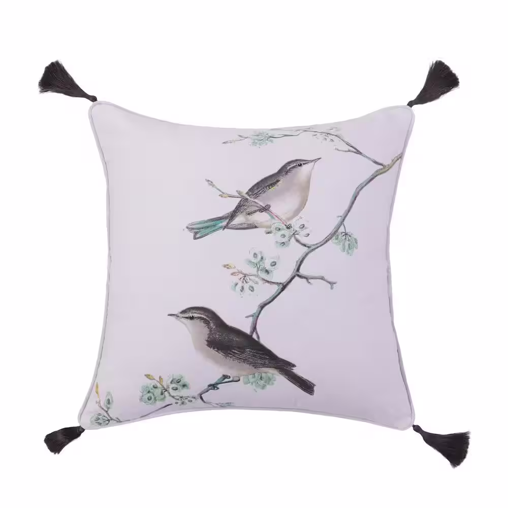 None Legacy Green, Grey, White Bird Branch Scene Print with Corner Tassels 18 in. x 18 in. Throw Pillow