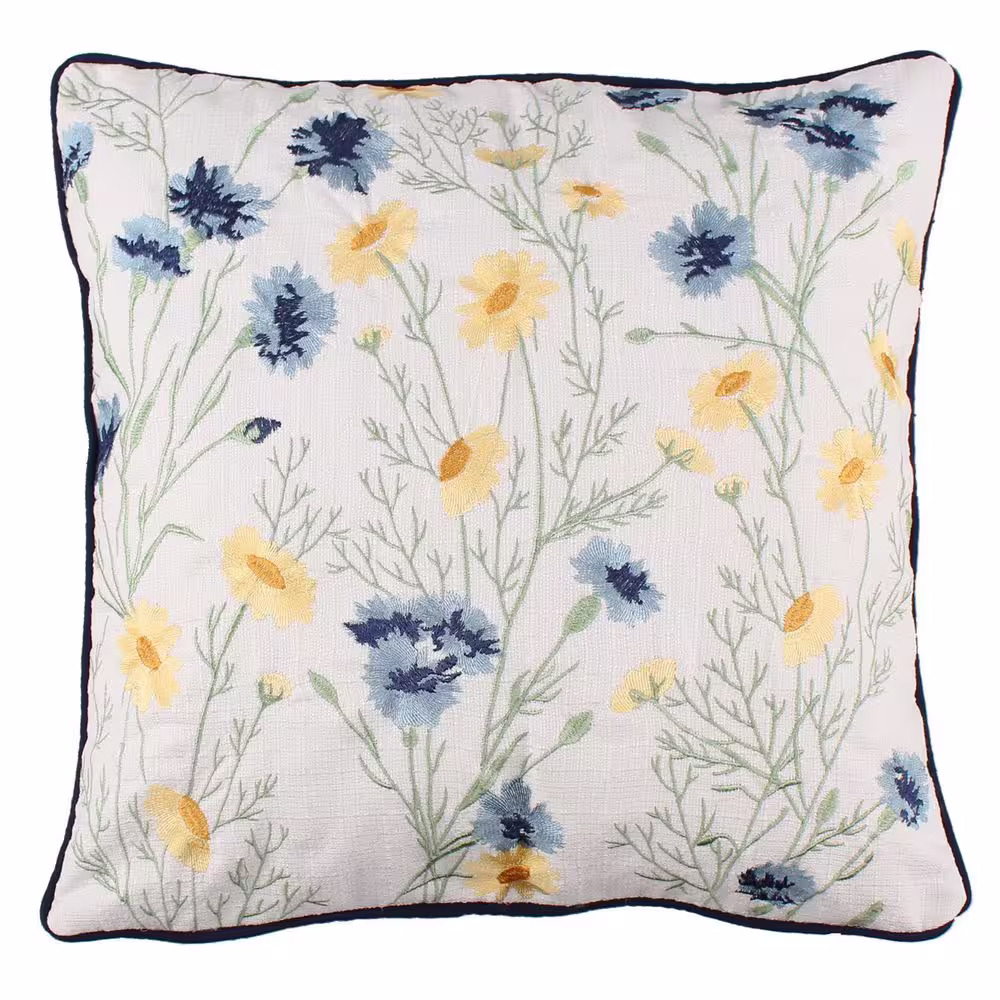 None Linnea Blue and Yellow Floral Embroidered 18 in. x 18 in. Throw Pillow