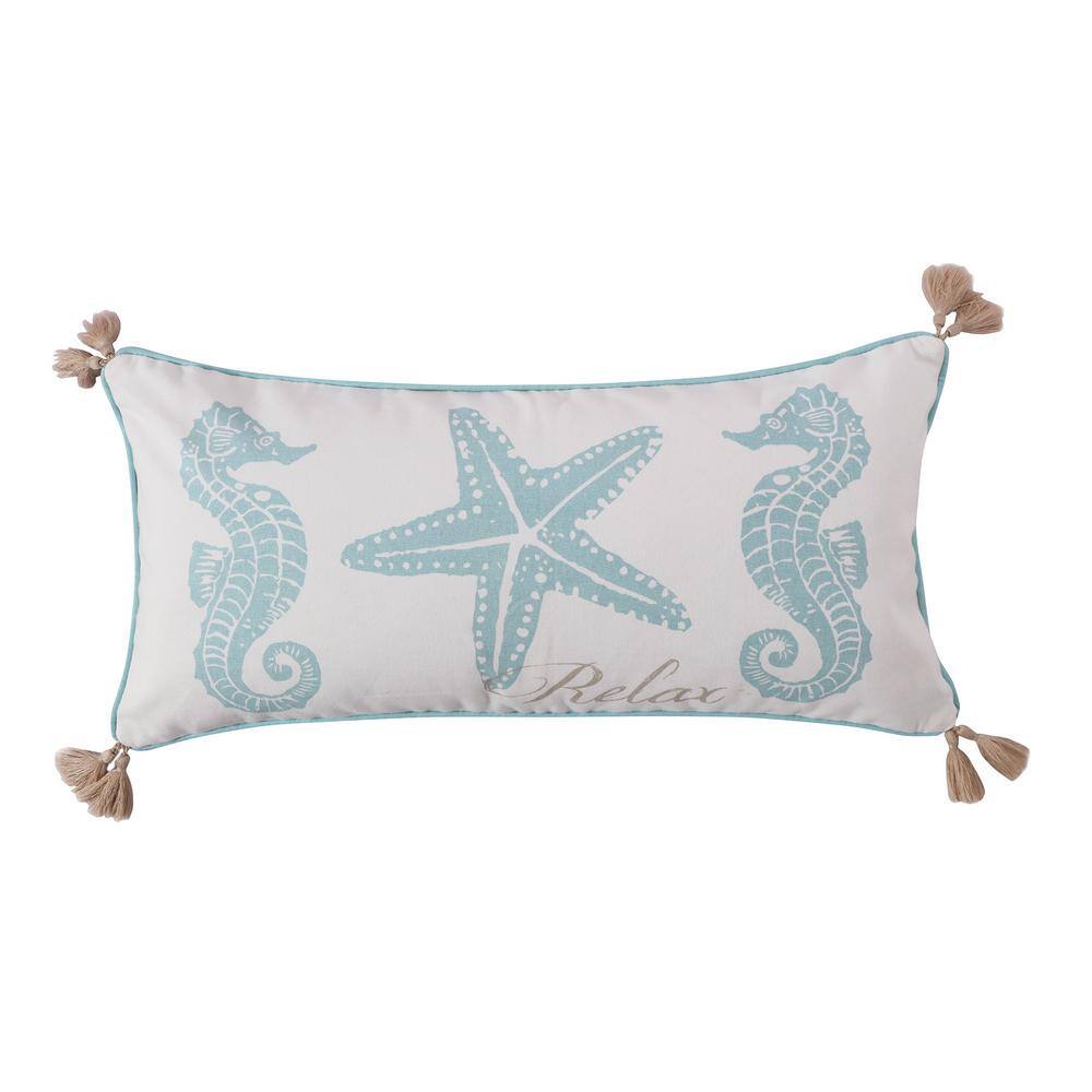 None Icaria White, Blue Seahorses, Starfish "Relax" Print With Corner Tassels 12 in. x 24 in. Throw Pillow