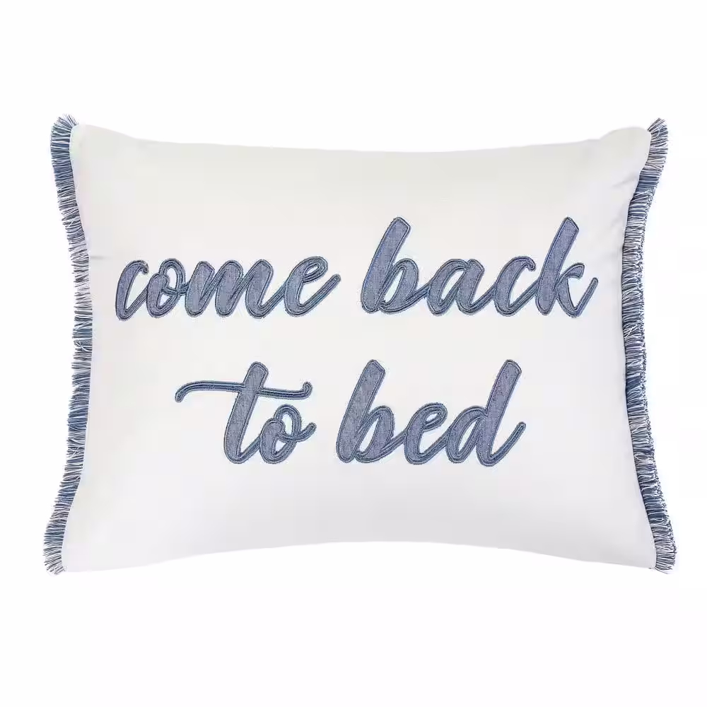 None Abelia White, Blue "Come Back To Bed" Applique Embroidered Side Fringe 14 in. x 18 in. Throw Pillow