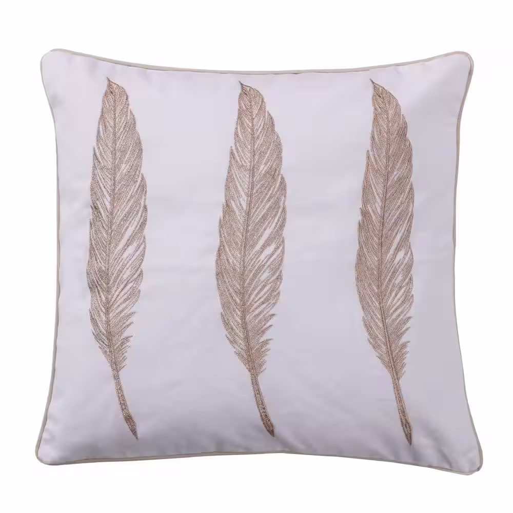 None Pisa White, Gold Embroidered Feathers 18 in. x 18 in. Throw Pillow