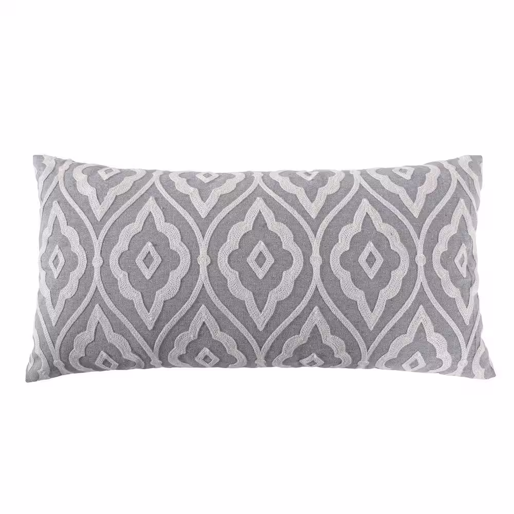 None Tamsin Grey, Off-White Embroidered Trellis Design 24 in. x 12 in. Throw Pillow