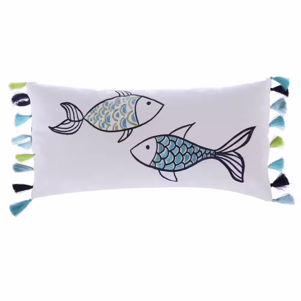None White, Blue, Green Embroidered Fish With Side Tassels 12 in. x 24 in. Throw Pillow