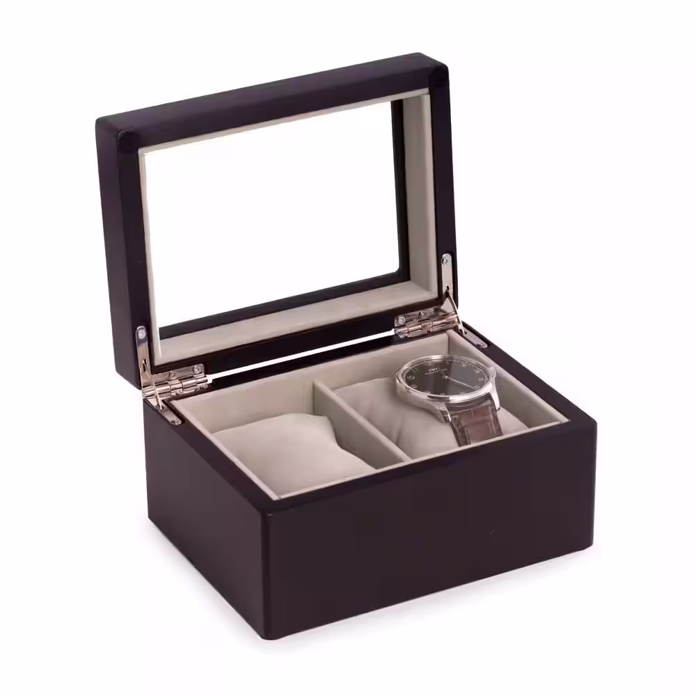 BEY-BERK Matte Black Wood 2-Watch Box with Glass Top, Velour Lining and Pillows