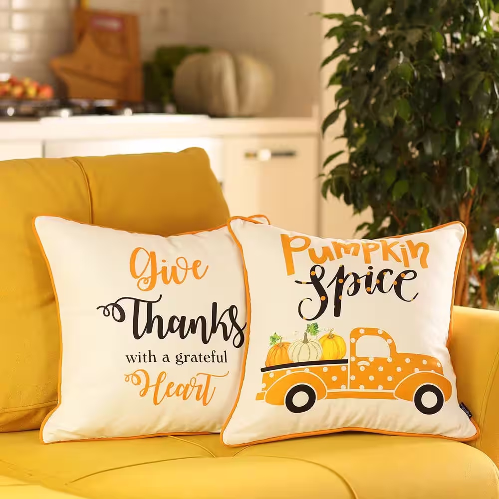 None Decorative Fall Thanksgiving Throw Pillow Cover Pumpkin Truck & Quote 18 in. x 18 in. White & Orange Square Set of 2