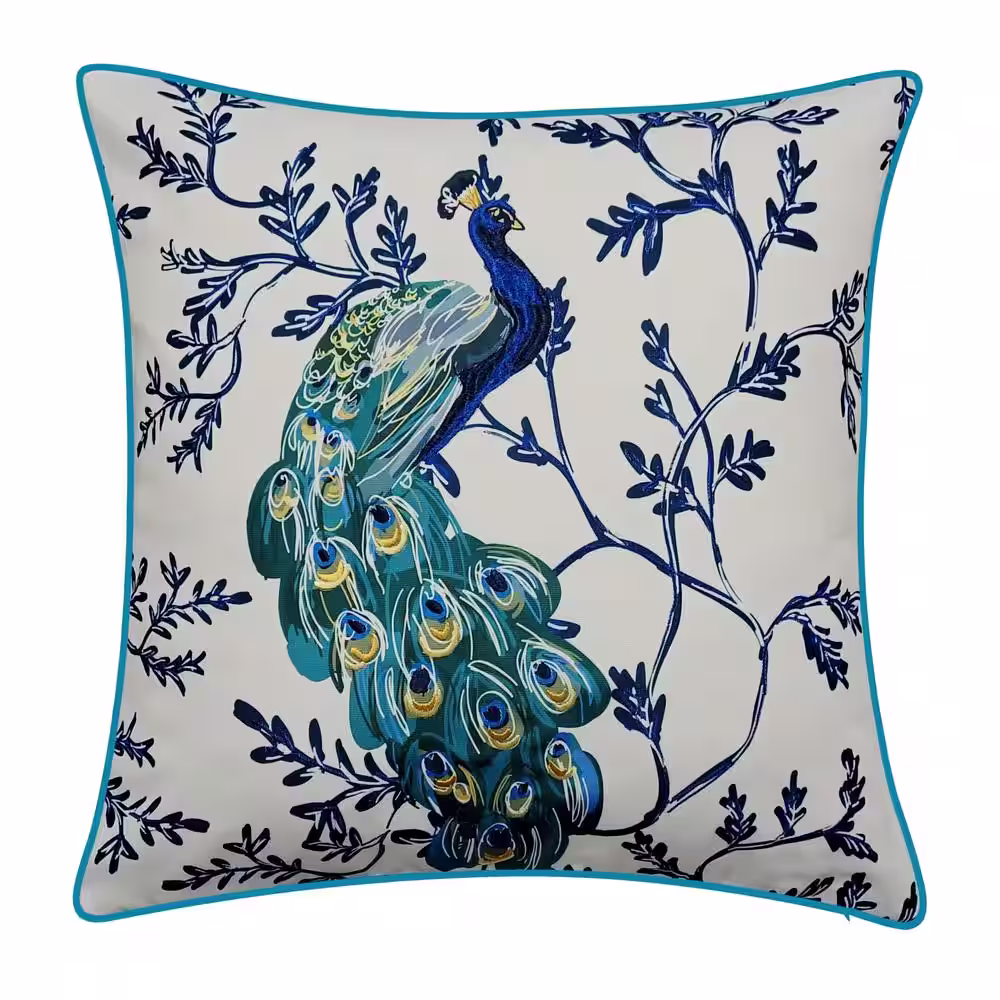 Edie@Home Turqoise Peacock Print with Embroidery Indoor/Outdoor 20 x 20 Decorative Throw Pillow