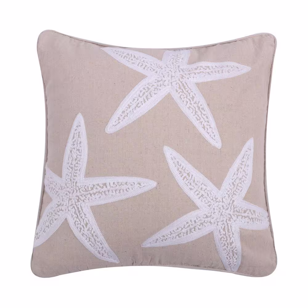 Levtex Home Stone Harbor White and Natural Beige Starfish Embroidered 18 in. x 18 in. Throw Pillow