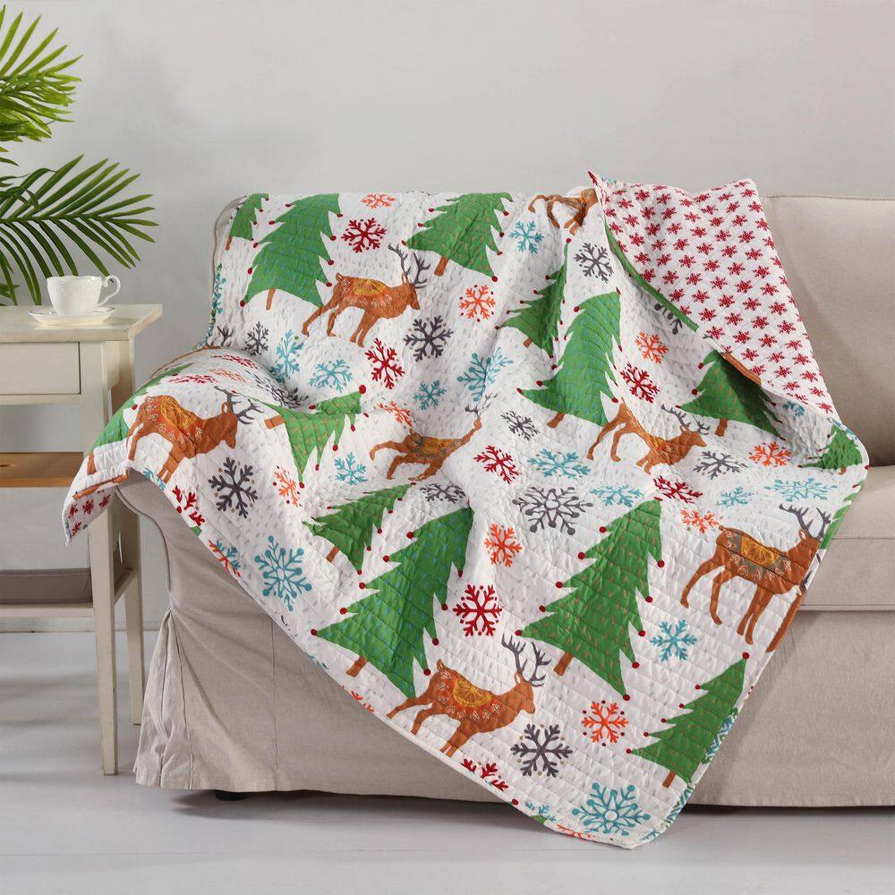 None Tinsel Green Cream Red Reindeer Christmas Tree Quilted Microfiber Throw Blanket