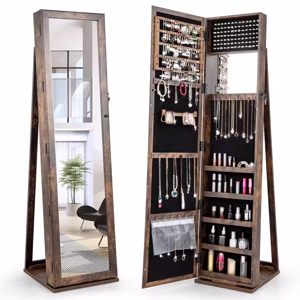 Costway Brown Mirrored Jewelry Cabinet Armoire Lockable Standing Storage Organizer with Shelf