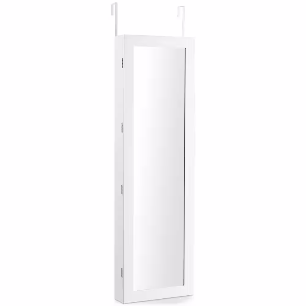 HONEY JOY 14.5 in. L x 3.8 in. W x 47 in. H White Wood Wall Mounted Mirrored Jewelry Organizer Armoire Cabinet with LED and Lock