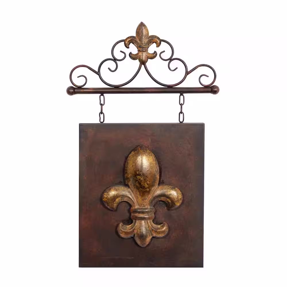 Litton Lane Metal Bronze Suspended Fleur De Lis Wall Decor with Scrollwork Hanger