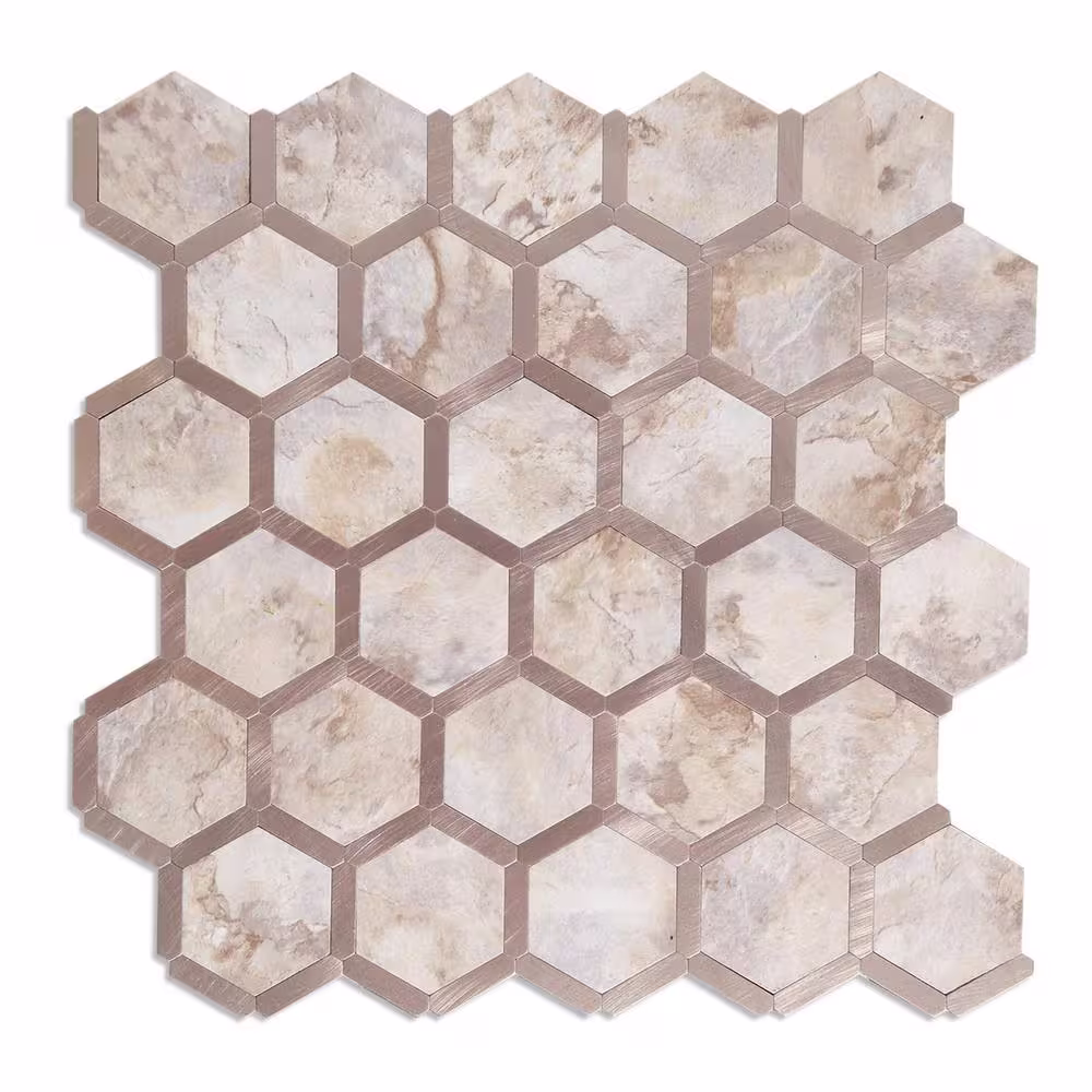 None Hexagon Ecru with Gold 12 in. x 12 in. PVC Peel and Stick Backsplash Wall Tile (5 sq.ft./5-Sheets)