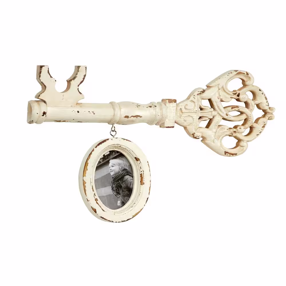 Litton Lane 4 in. x 6 in. Decorative Antique Key and Hanging Picture Frame Wall Decor with Distressed White Finish