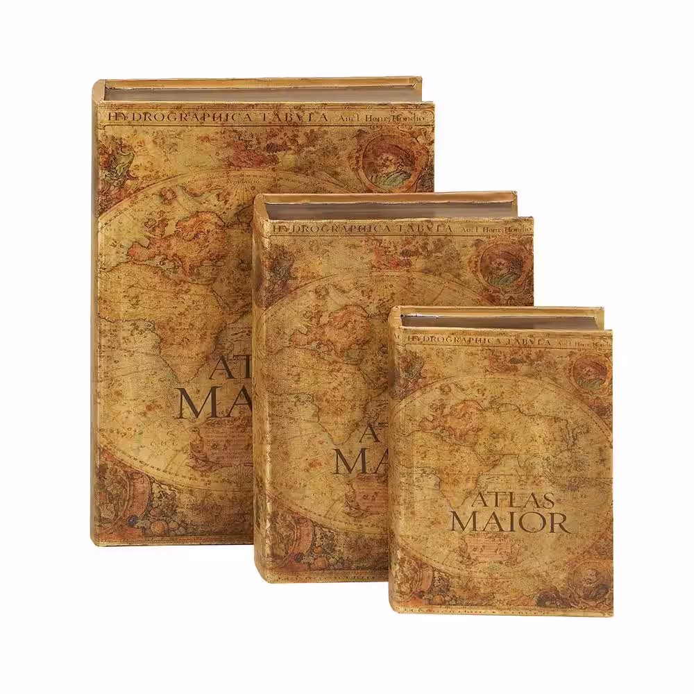 Litton Lane Rectangle Wood Faux Book Box with World Map Cover (Set of 3)