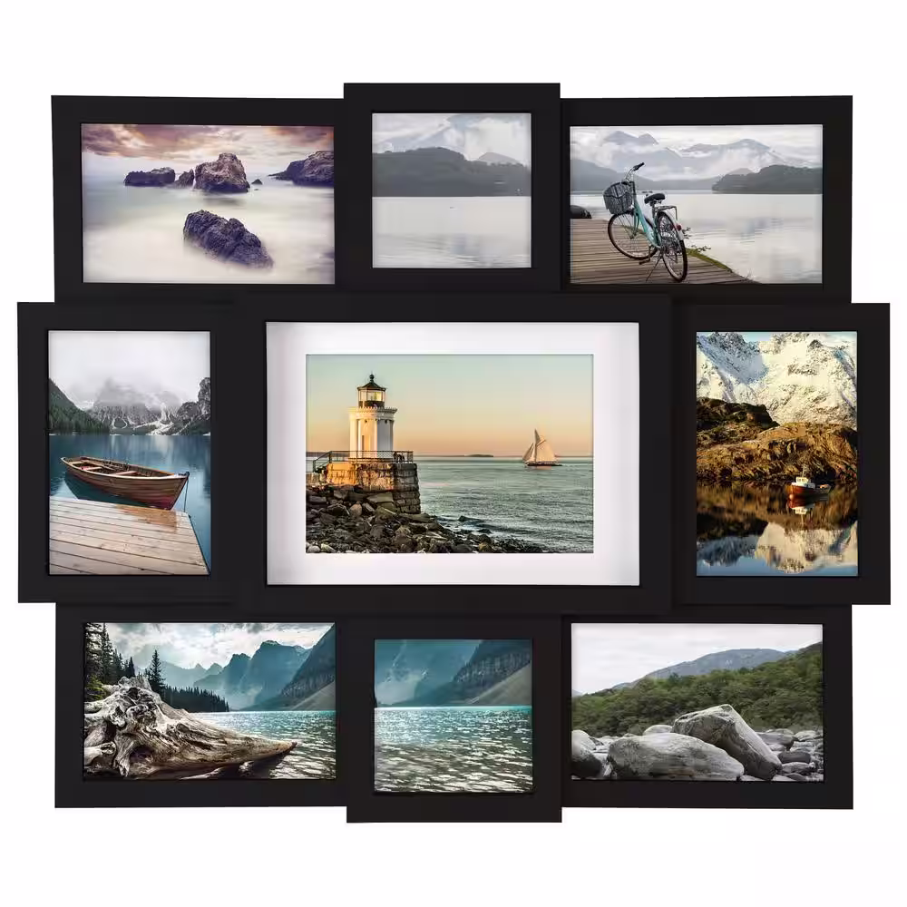 Malden International Designs 2-4 in. x 4 and 6-4 in. x 6 and 1-5 in. x 7 in. Black 9-Opening Array Puzzle Collage Picture Frame