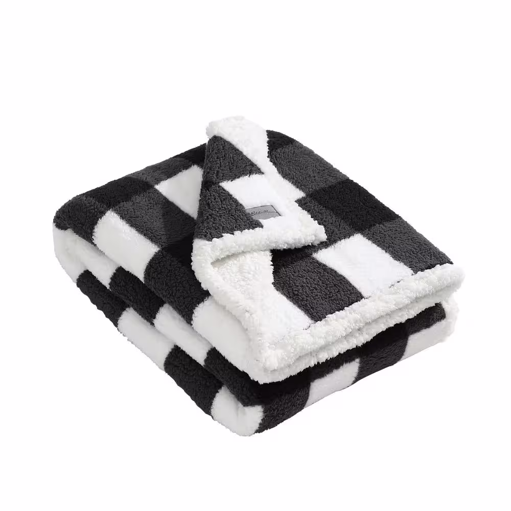 EDDIE BAUER Cabin Plaid Printed Sherpa Black Microfiber Throw Blanket