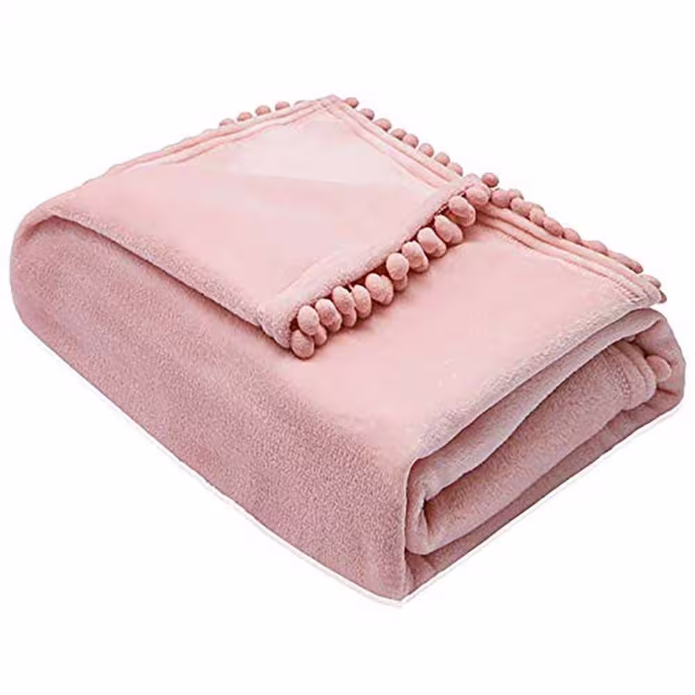 None Misty Pink 60 in. x 80 in. Lightweight Soft Microfiber Throw Blanket with Pom Pom Fringe