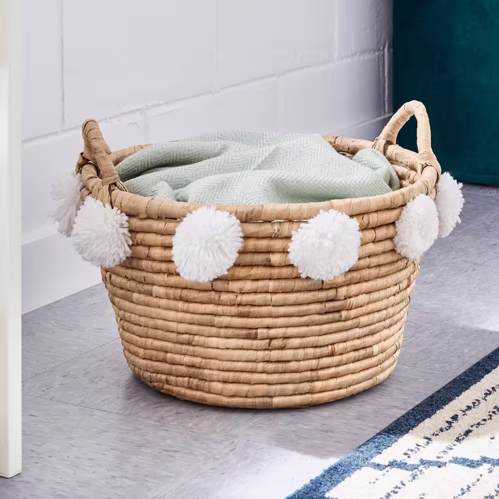 StyleWell Oval Natural Water Hyacinth Decorative Basket with White Pompom Balls