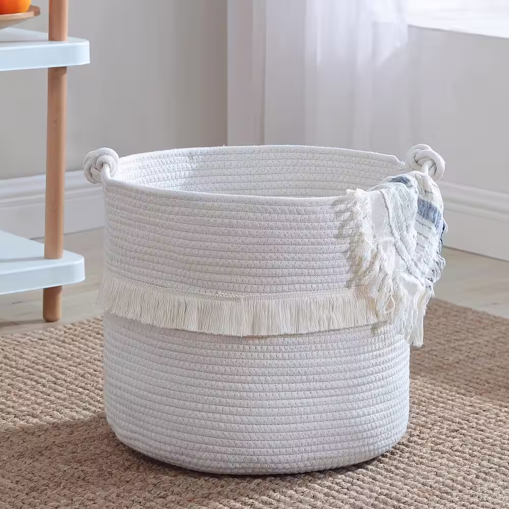 None Round Woven Boho Cotton Rope Storage Basket with Fringe Tassels