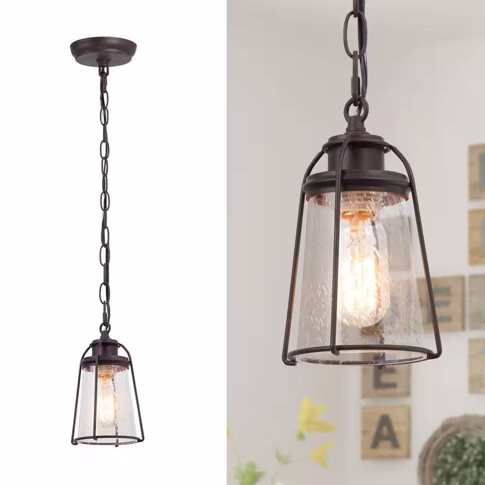 Uolfin Farmhouse Black Kitchen Pendant Light, Maya 1-Light Modern Industrial Bronze Pendant Light with Caged Seeded Glass Shade