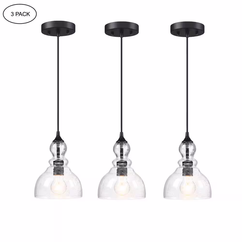 Hukoro 1-Light Kitchen Island Teardrop Seeded Glass Pendant with Matte Black finish (3-Pack)