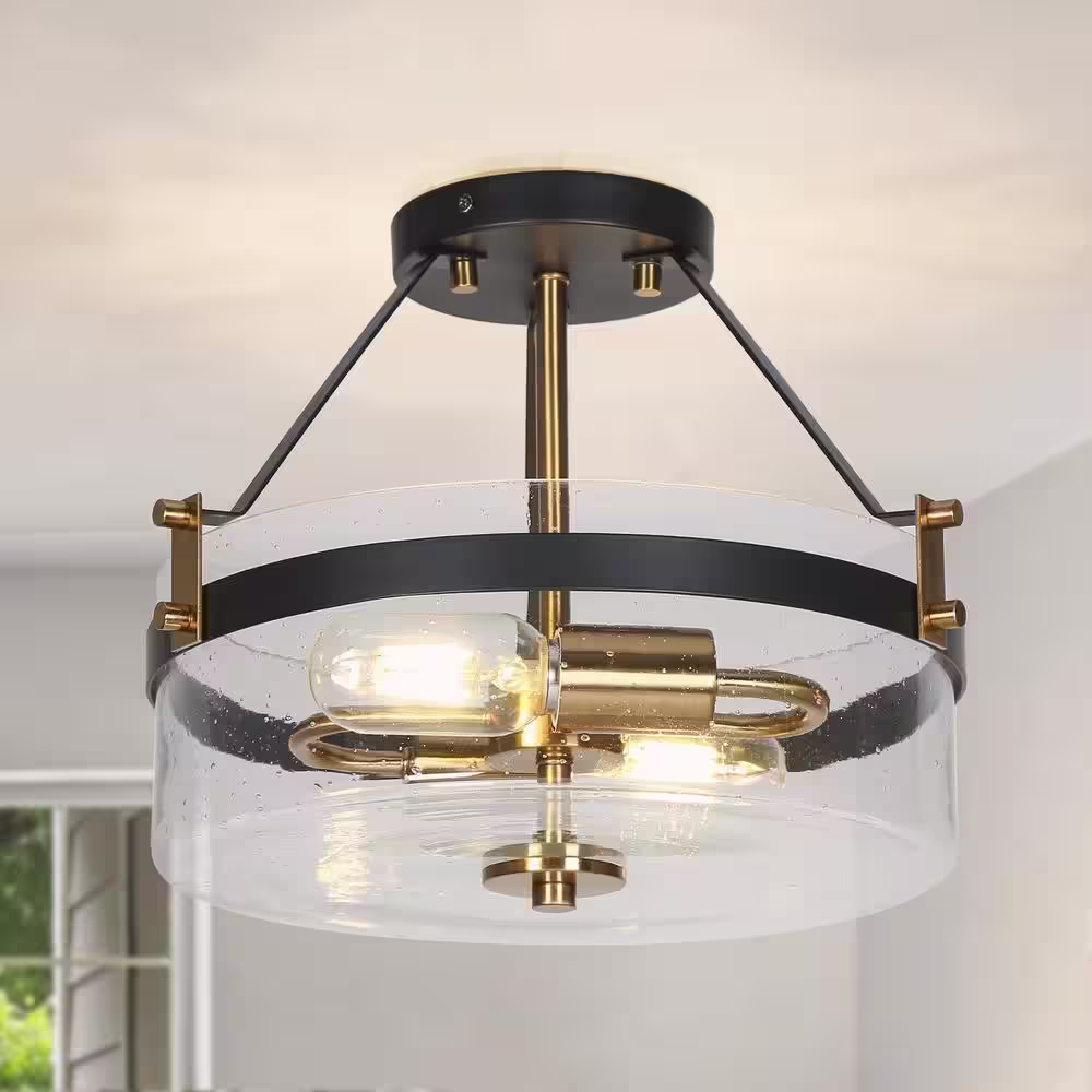 Uolfin Modern Farmhouse Black Semi-Flush Mount, 12.5 in. 2-Light Plated Gold Kitchen Ceiling Fixture Light with Seeded Glass