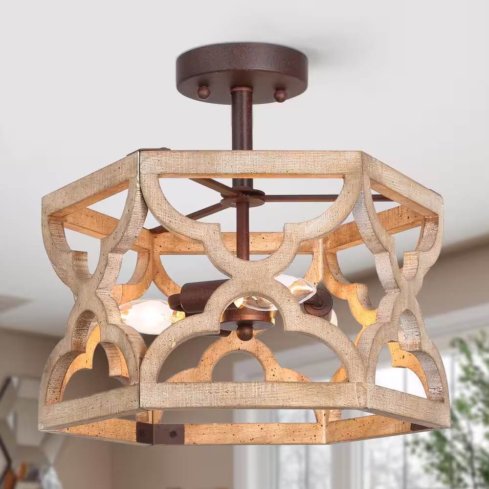 LNC Farmhouse Hexagon Antique Wood Semi-Flush Mount, Geometric 3-Light Brown Kitchen Ceiling Light with Rusty Metal Accents
