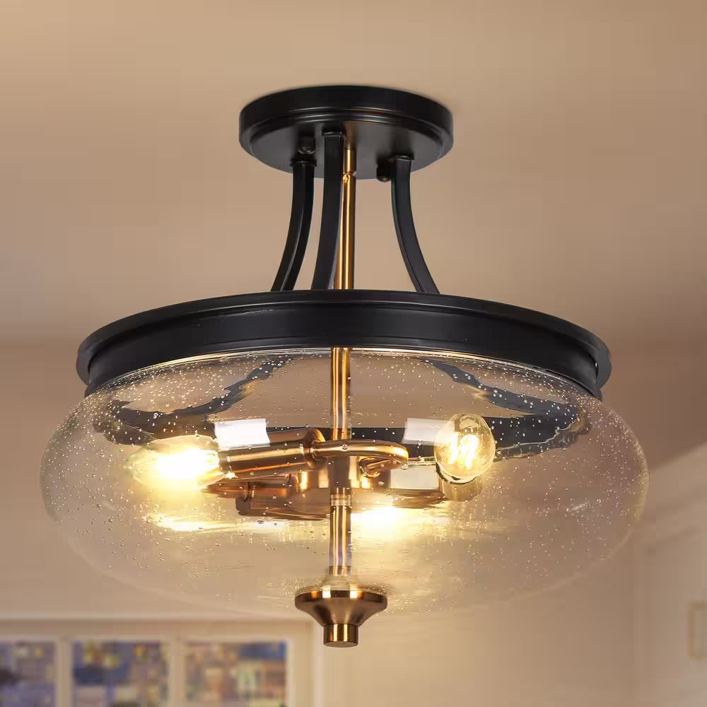 Uolfin Modern Farmhouse Black Semi-Flush Mount Light, 3-Light Gold Kitchen Ceiling Lights with Bowl Seeded Glass for Bedroom